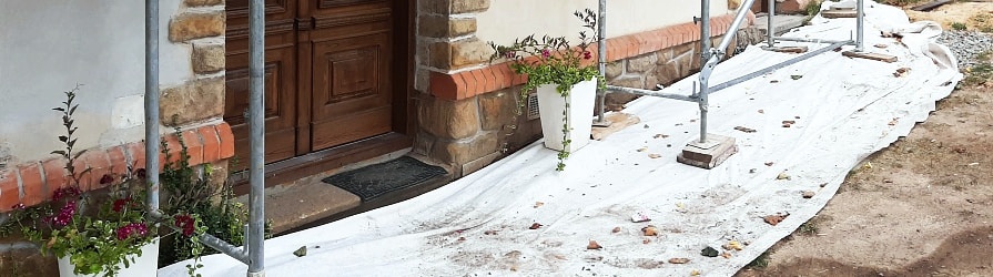 Netkaná geotextília ako ochrana betónovej dlažby pri stavebných prácach na fasáde domu
